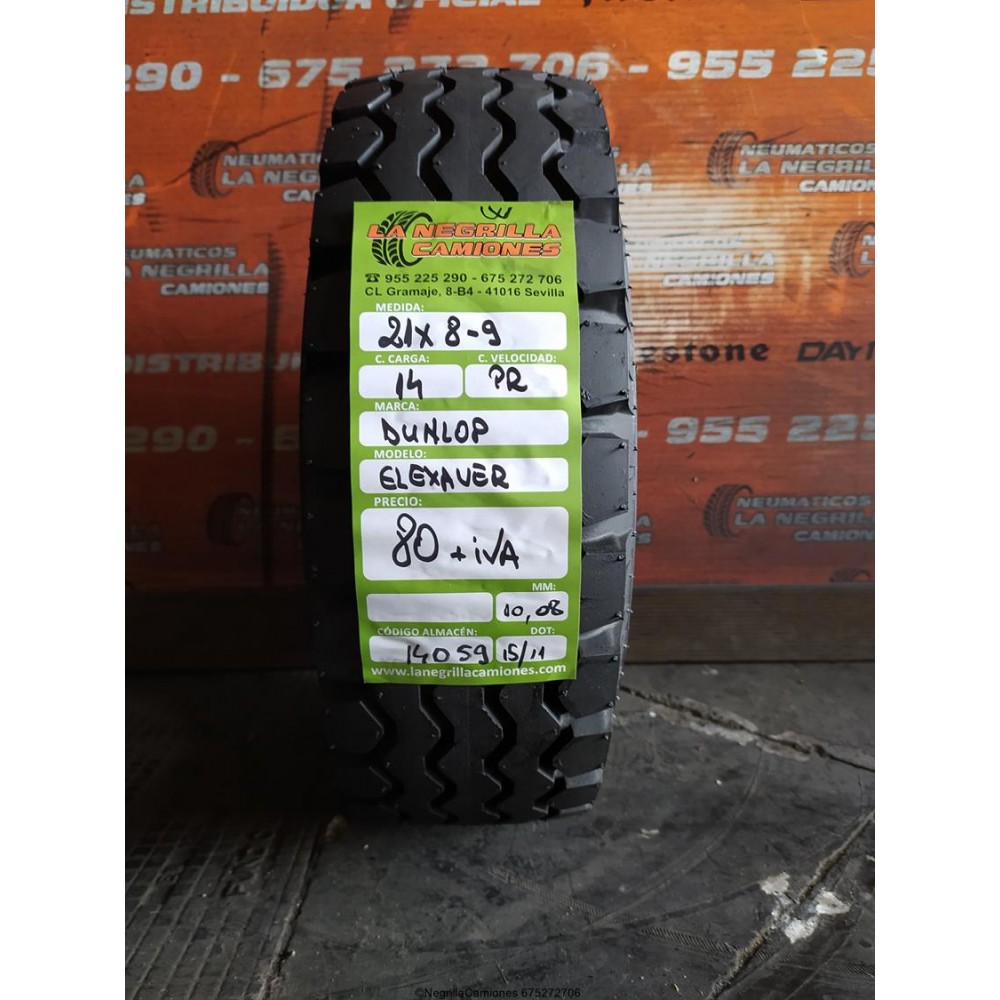 Neumatico para camion con medida 21X8 -9 Marca Dunlop. Nuestros precios llevan montaje incluido. Para cualquier otra medida escribe un WhatsApp al 675272706. Tambien atendemos preguntas al telefono 955225290 (en horario comercial), o si lo prefieres, ven directamente a nuestro taller y almacen ubicados en Sevilla y quedaras sorprendido de la calidad. Tenemos 1.000 unidades de todo tipo en 90% de las medidas tanto nuevos como seminuevos.